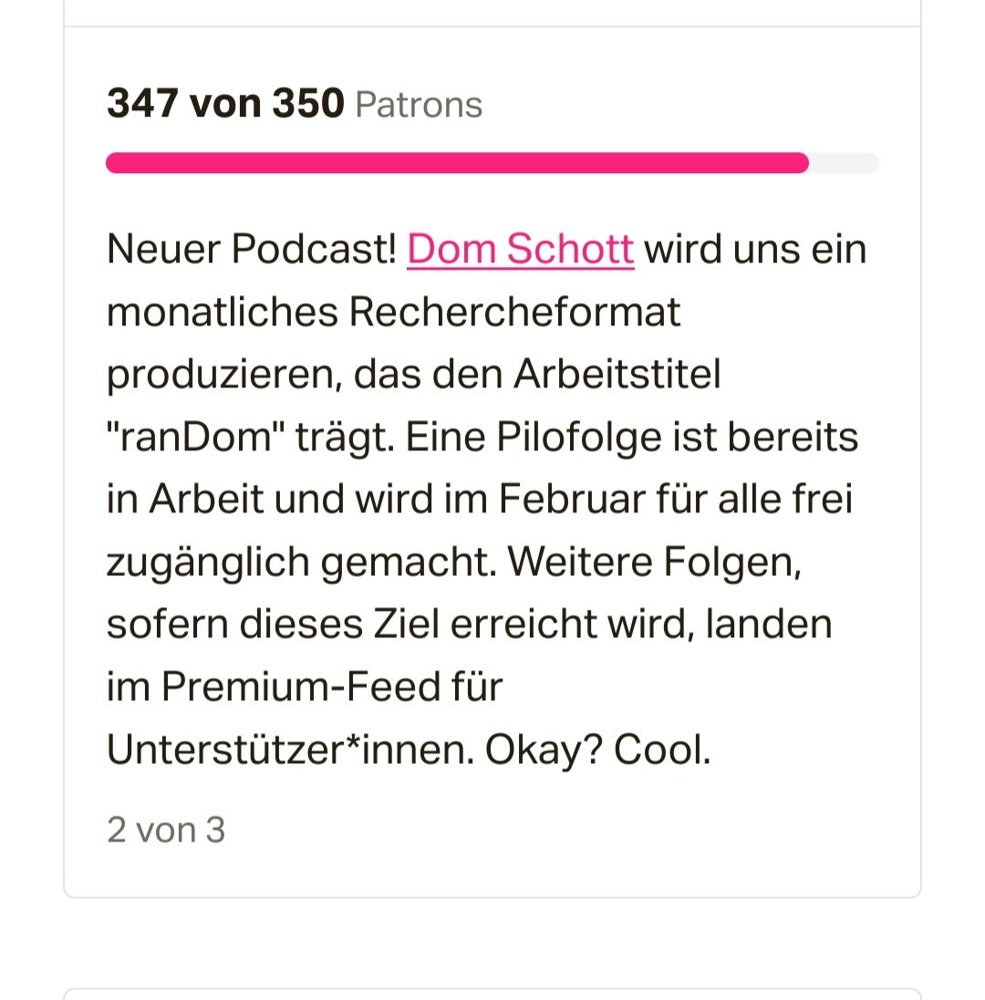 Jetzt müssen wir nur hoffen, das der Verlust an Patreons zum Monatsanfang nicht zu groß wird. Sonst dauert die Dom-Phase nur 15 Stunden, das kann es ja nicht sein.