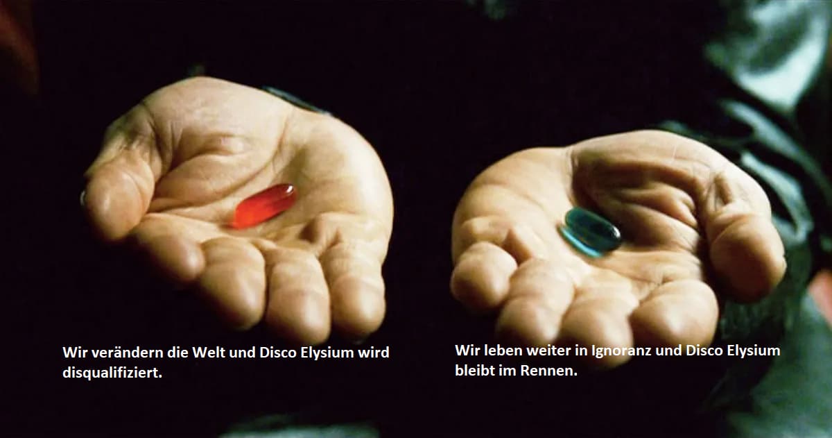 Hiermit beantrage ich die Disqualifizierung von Disco Elysium vom Finale, weil es kein Rollenspiel sondern ein Bilder-Text-Adventure (aka Visual Novel) ist. Die versammelte Gymnasiastenschaft im Deutsch-LK hat also die gesamte Staffel eine Themenverfehlung hingelegt!