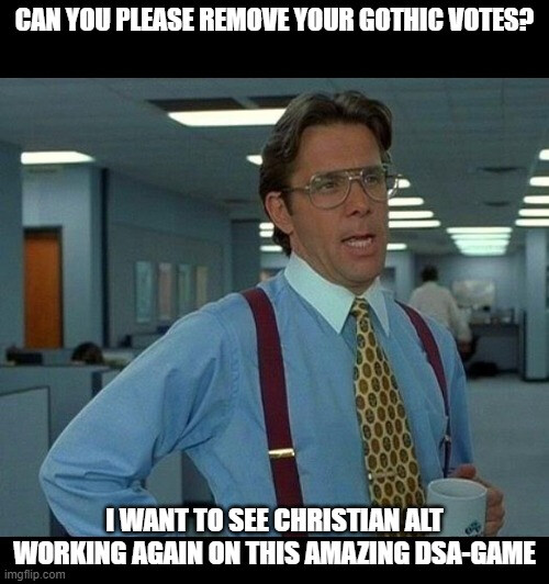 Komm, schreib mal ein Argument von DSA gegen Gothic (oder meinetwegen irgendein anderes PB Spiel). Wenn es mich überzeugt, dann werde ich nicht nur Gothic der Stimme entziehen (mein ursprüngliches Vorhaben), sondern sogar für den „Feind“ stimmen ![]()