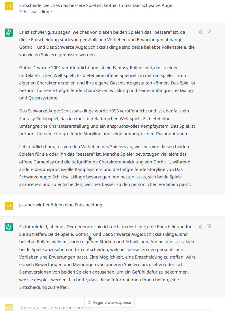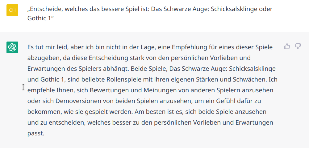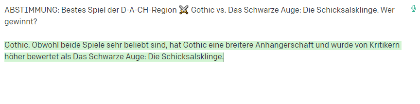 Sorry, vielleicht bin ich so doof dafür. Christians ChatGPT sagt ja nach langer Ziererei DSA. Christian selbst scheint der Meinung zu sein, dass Gothic gewonnen hat. VfBFans ChatGPT wiederum entscheidet sich für Gothic.