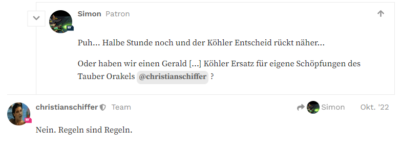 Ohne das aufwärmen zu wollen, finde ich nur bemerkenswert, dass Christian Schiffer einen möglichen Gerald-Köhler-Ersatz in dieser Staffel schon mal recht eindeutig verneint hat ![]()