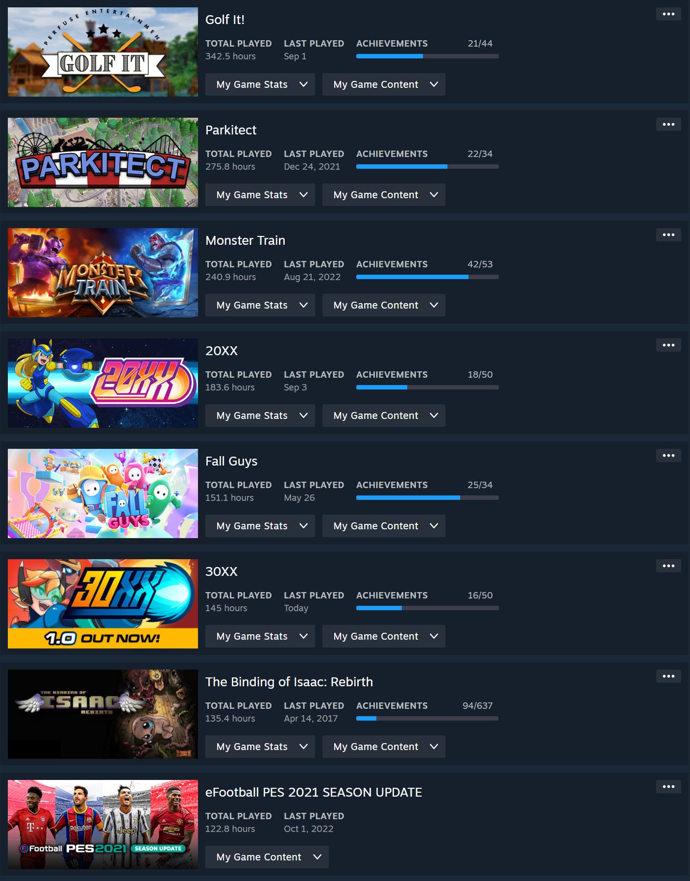 Auf Platz 1 sind es 342h, auf Platz 12 103h, wobei bei manchen Titeln durchaus eine Menge Windows/AfK-Zeit drin ist (ich denke, am meisten bei Parkitect, was man eigentlich auch gut als Bildschirmschoner verwenden kann