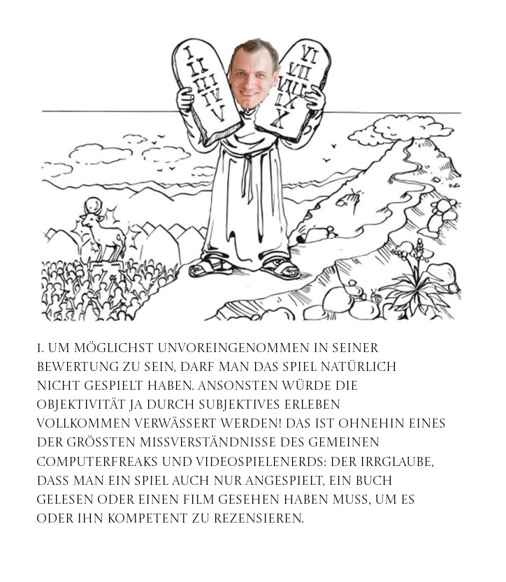 Aber natürlich, erstes LGS-Gesetz: Um möglichst unvoreingenommen in seiner Bewertung zu sein, darf man das Spiel natürlich NICHT gespielt haben. Ansonsten würde die Objektivität ja durch subjektives Erleben vollkommen verwässert werden! Das ist ohnehin eines der größten Missverständnisse des gemeinen Computerfreaks und Videospielenerds: der Irrglaube, dass man ein Spiel auch nur angespielt, ein Buch gelesen oder einen Film gesehen haben muss, um es oder ihn kompetent zu rezensieren.