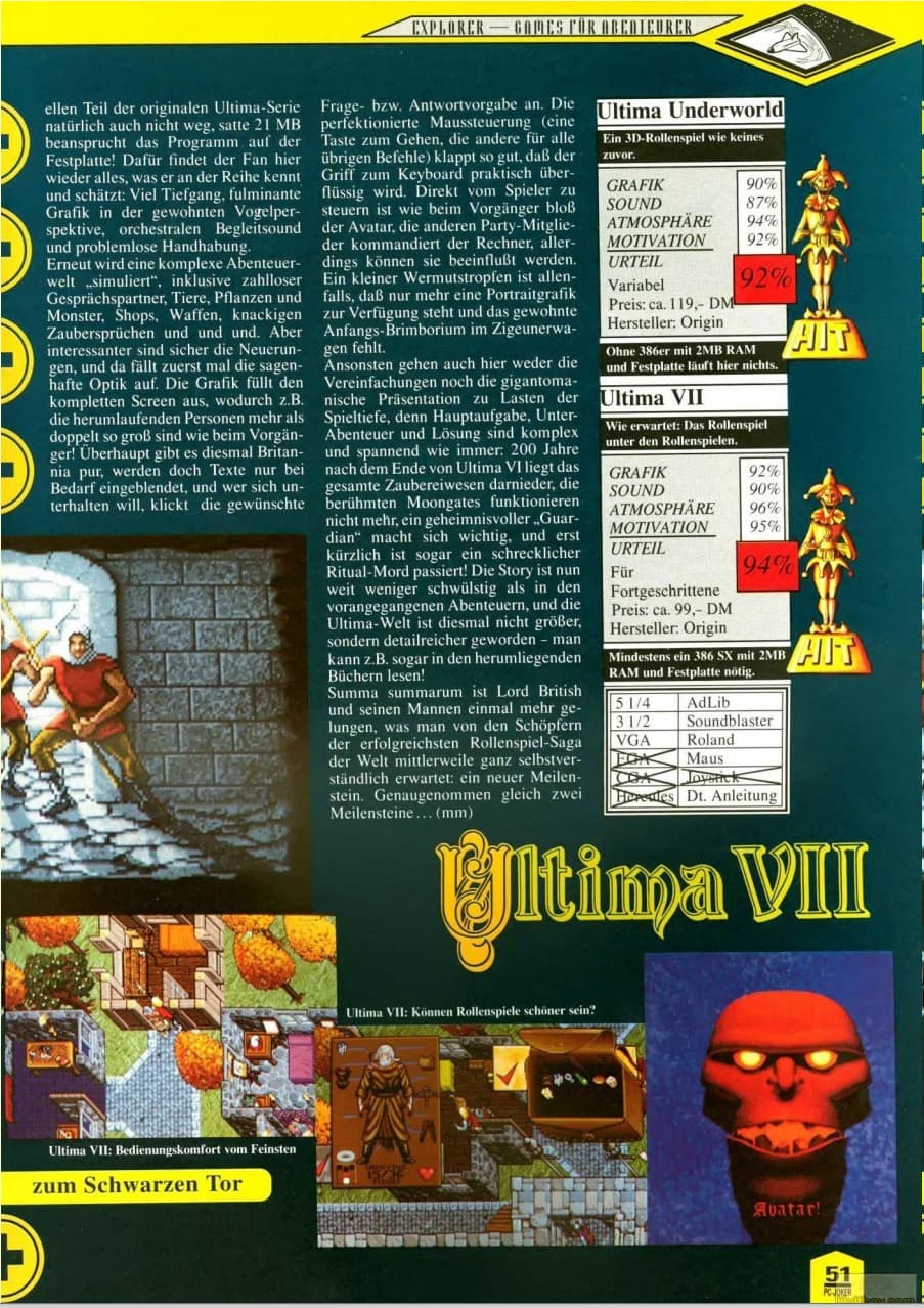 Wie genial Ultima VII ist zeigt schon die Tatsache, dass der PC Joker seinerzeit nur zwei Spalten brauchte um zu Begründen, warum Ultima VII 94% verdient hat.
