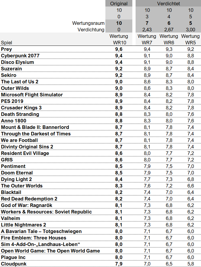 Das hat mich zu der Überlegung geführt, was wohl mit Wertungen passieren würde, wenn man die im 10er Spektrum vergebenen Wertungen auf einen verdichteten Wertungsraum normalisiert, und damit den Druck ein bisschen erhöht.