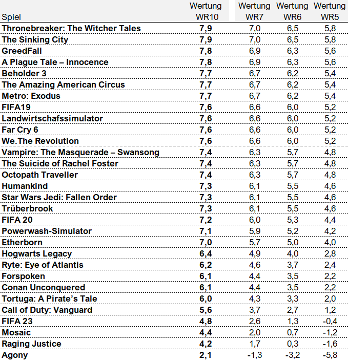 Anders als früher gibt es heute allgemein kaum mehr Wertungen im unteren Bereich, was es leider auch vereitelt, Spielen trotz der gehobenen Standards bei Verfehlungen mal ordentlich eine Powergurke reinzudrücken. Das Habitat der Wertungen befindet sich heute aufgrund der gehobenen Standards im Bereich zwischen 70 und 90. Ab und zu findet man Exemplare außerhalb des Lebensraums.