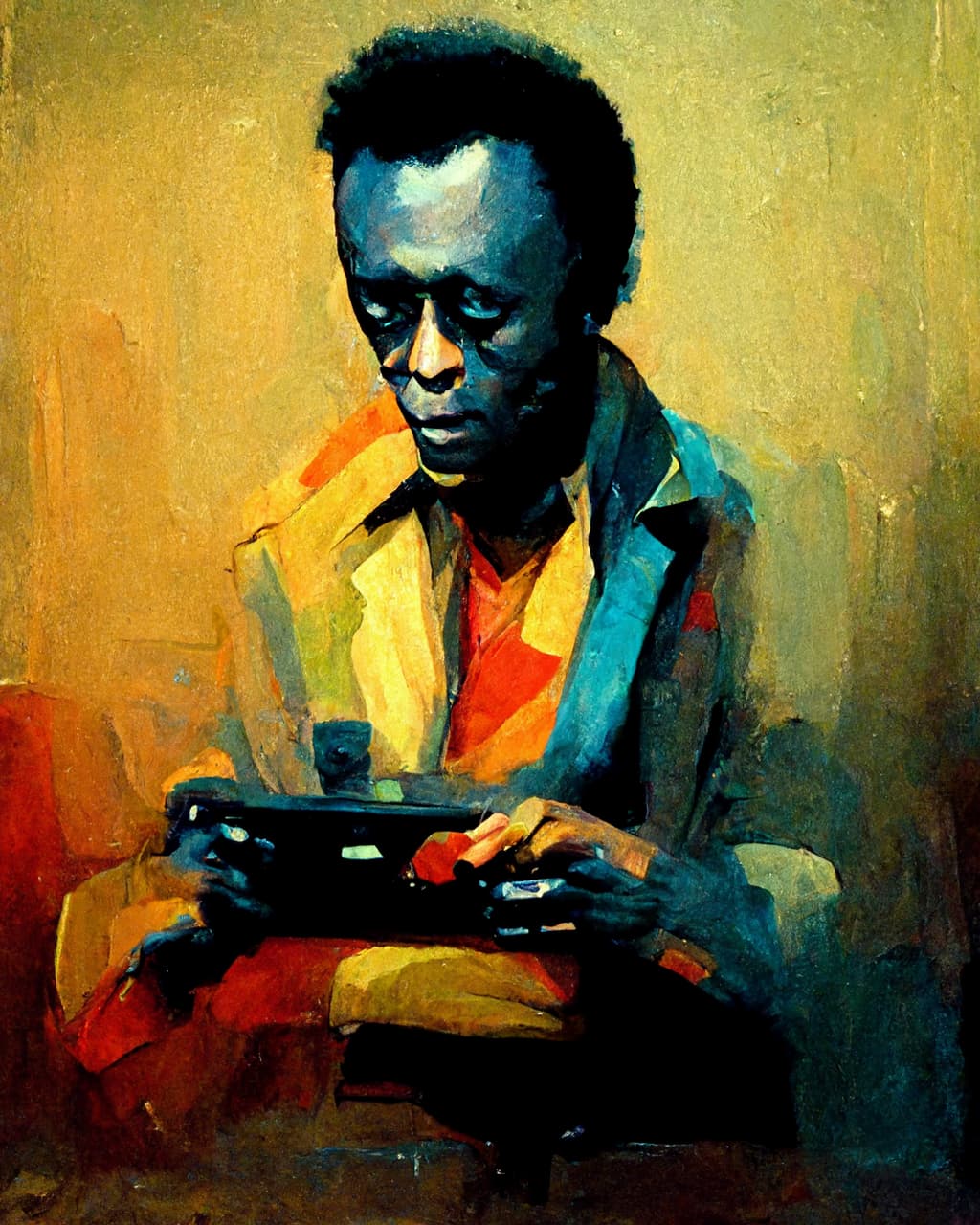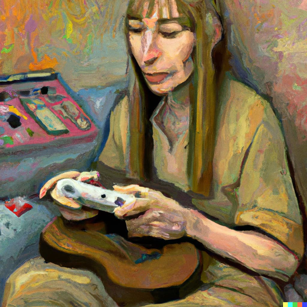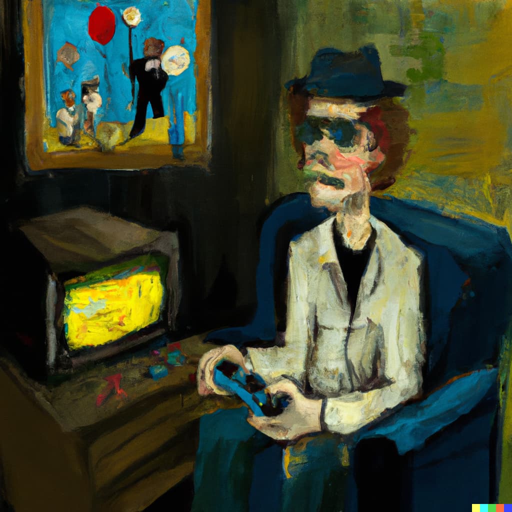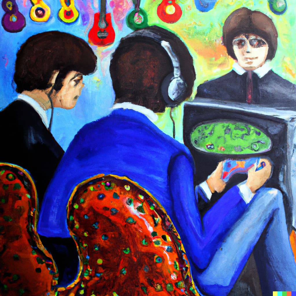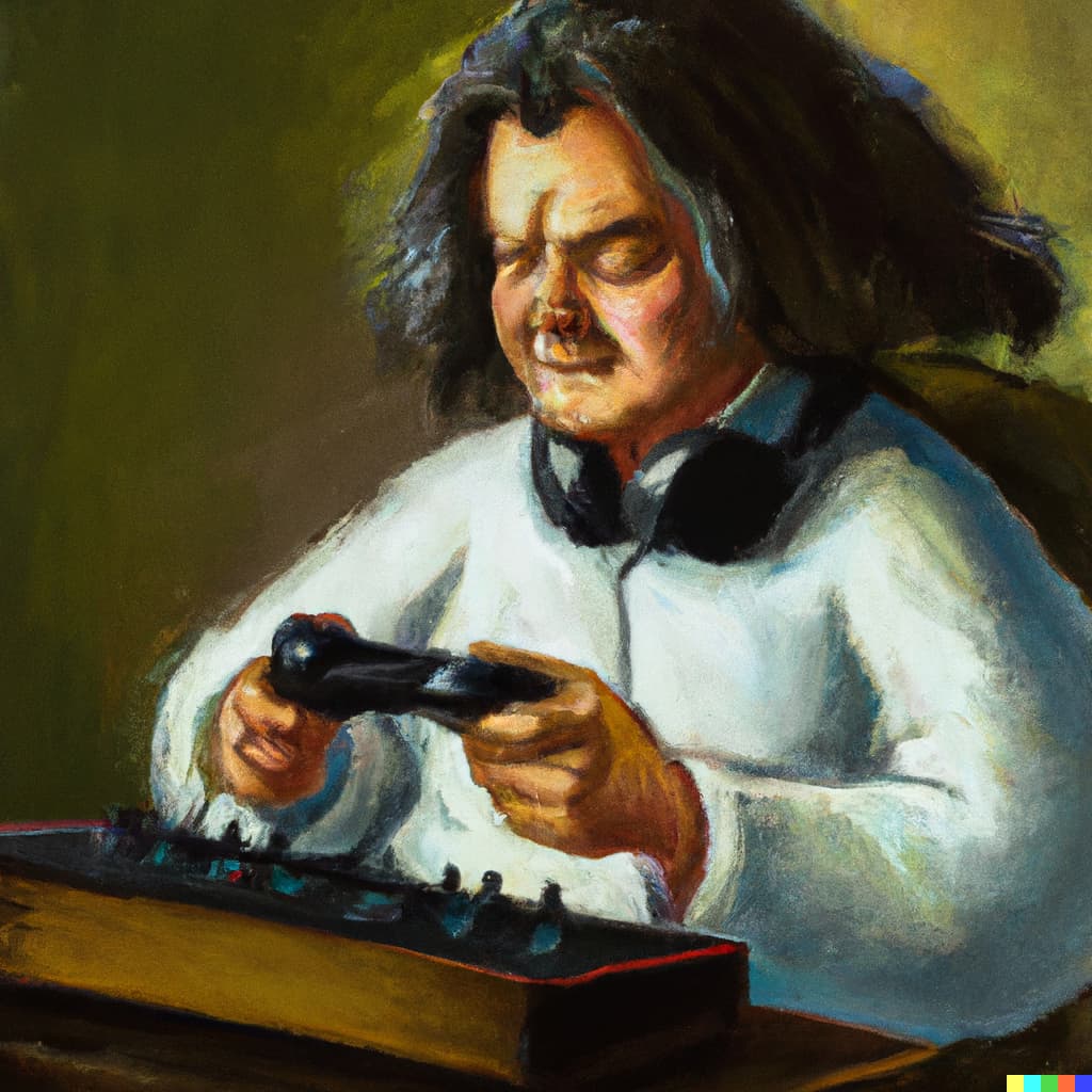Ich habe gerade sehr viel Spaß mit der AI von Dall-e und habe mal ein paar Ölbilder anfertigen lassen von wichtigen Musikern die Videospiele spielen.