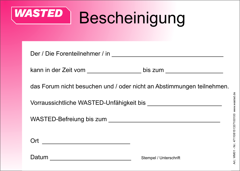 Vielleicht gelingt es ja noch, wenn ein vom Wasted-Obergremium abgestempeltes, offizielles Entschuldigungs-Formular für die Fehltage vorliegt ![]()