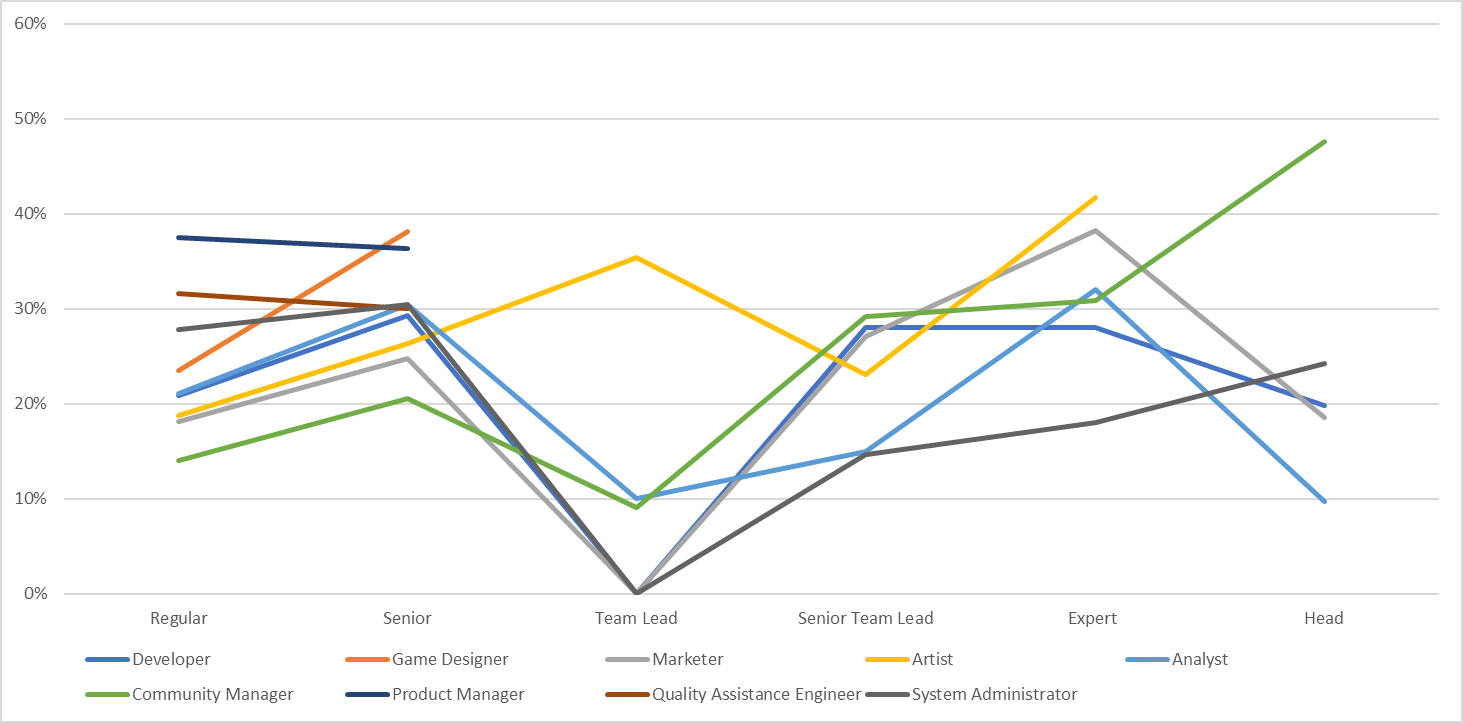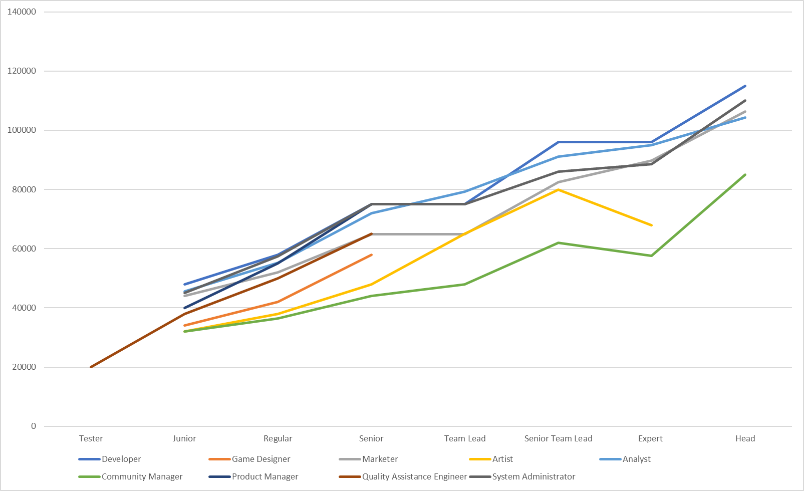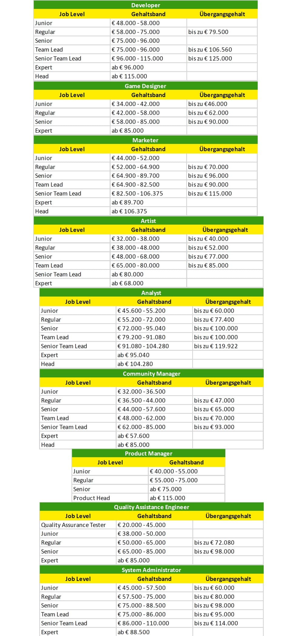 die Gehaltsstufen aber an sich müssen aber von z.B. Regular zu Senior aber eigentlich Konstant sein. Ich sag ja nicht, dass ein Developer und Artist gleich bezahlt sein sollten, aber die relative Steigerung der Gehälter durchaus.