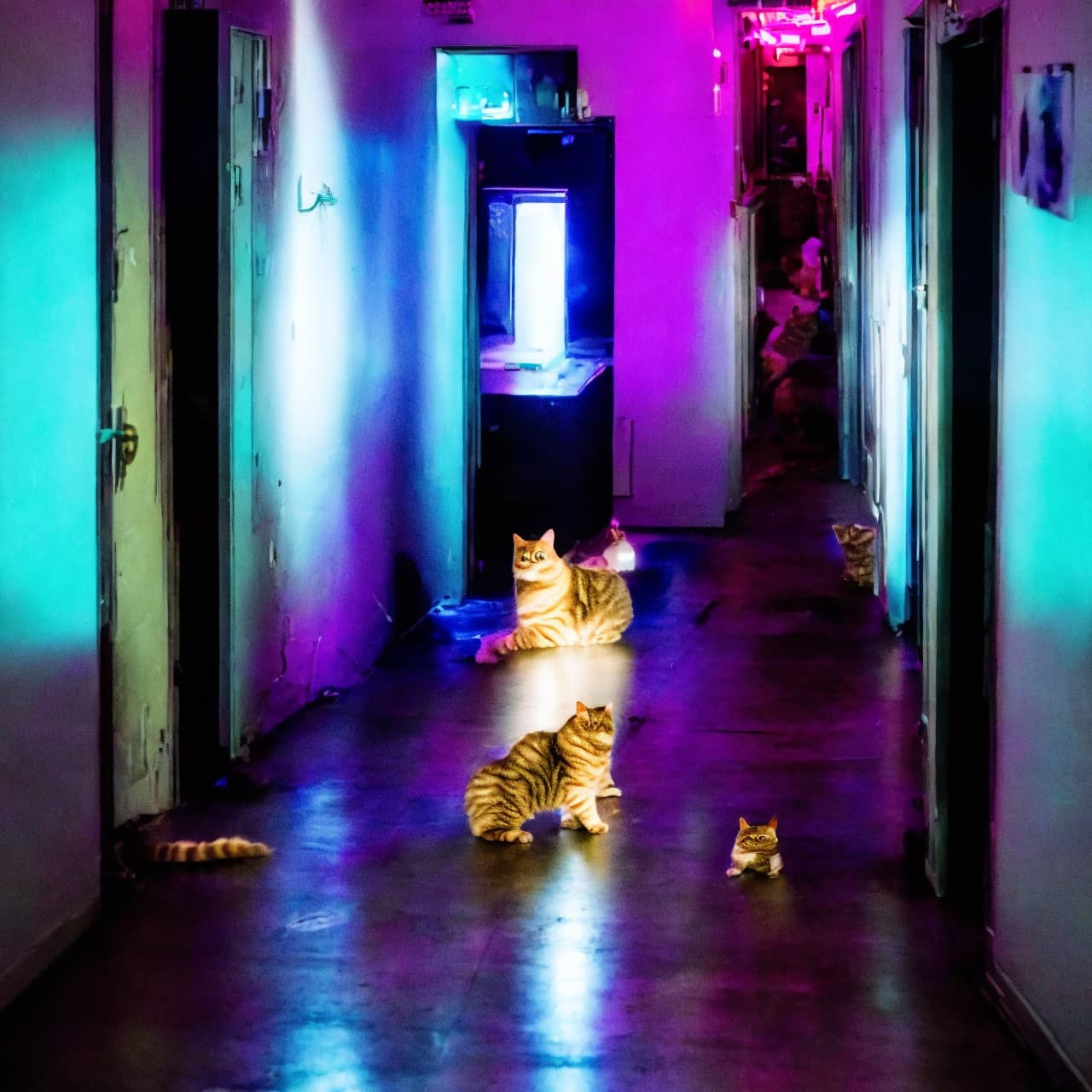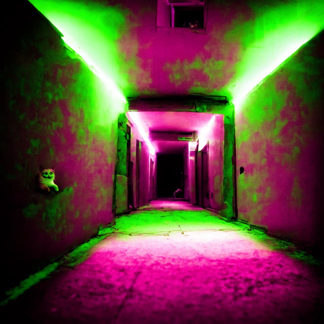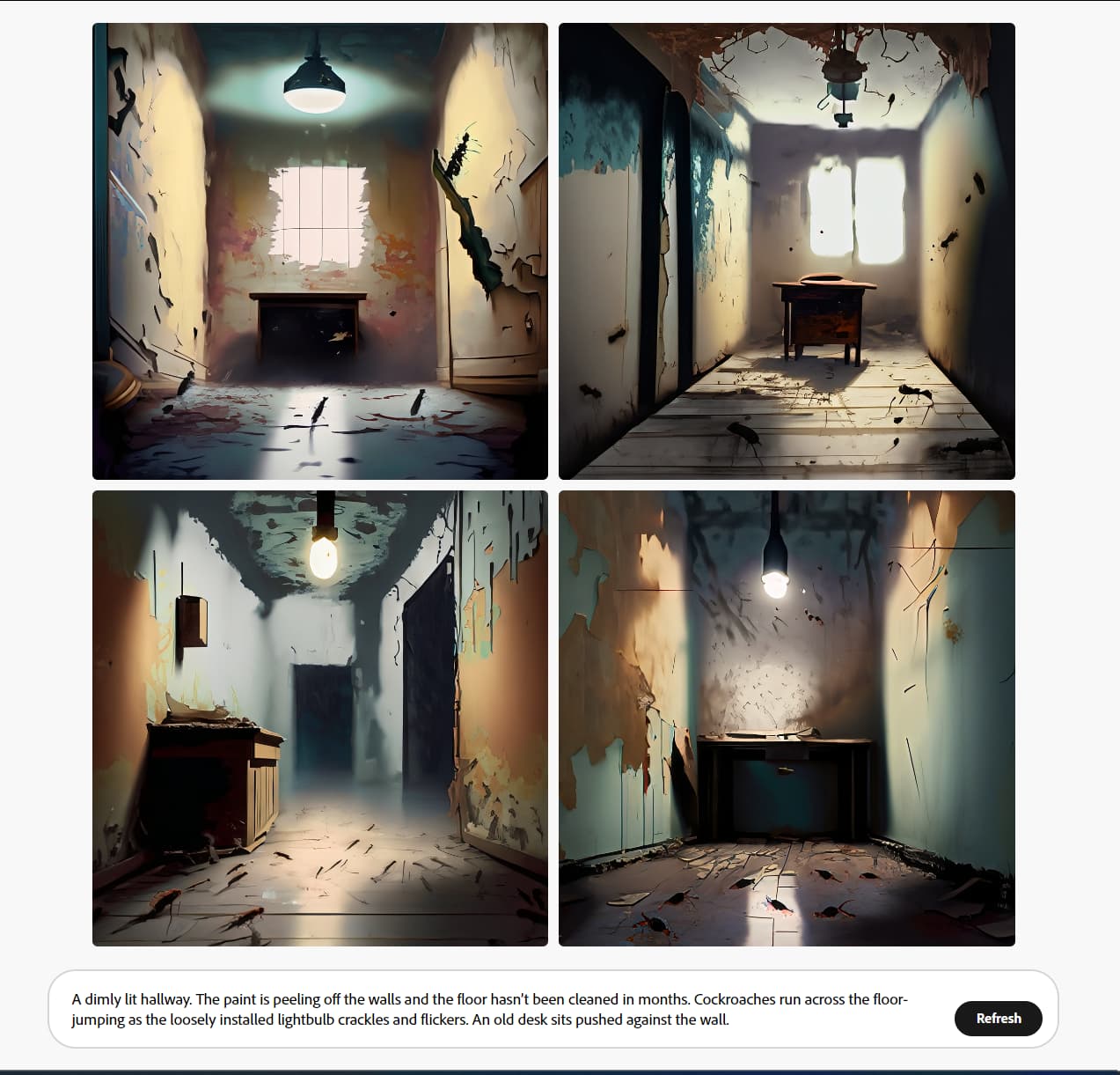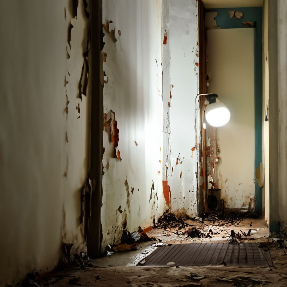 „A dimly lit hallway. The paint is peeling off the walls and the floor hasn’t been cleaned in months. Cockroaches run across the floor- jumping as the loosely installed lightbulb crackles and flickers. An old desk sits pushed against the wall.“