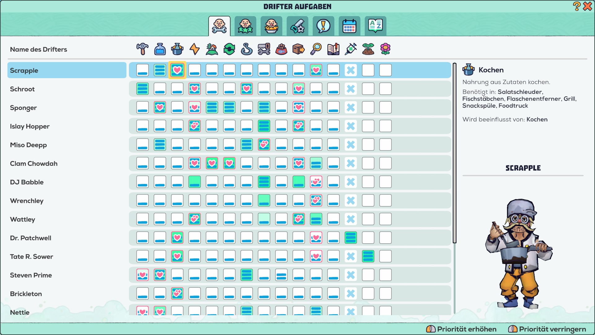 Die Drifter haben eine rudimentäre Hintergrundgeschichte, die ihre Charakterwerte bestimmt: manche mögen Angeln, daher freuen sie sich, wenn man sie angeln schickt. Andere können gut Kochen oder Forschen. Ob Lieblingsbeschäftigung und Können übereinstimmen überlässt der Zufall. Die Bewohner haben eigene Bedürfnisse (etwa Lieblingsessen) und brauchen mehr Zeit ihre Aufgaben zu erledigen je unerfahrener sie sind. Auch das Finden neuer Bewohner geht – bis auf die storyrelevanten Charaktere, dazu später mehr – eher zufällig von statten, wie alles in dieser prozedural generierten Welt. Über die Zeit sammeln die Bewohner Erfahrung die wir in Upgrades der Fähigkeiten investieren, damit unser Hobbyangler auch in der Lage wäre die Orca[1] zu leiten.