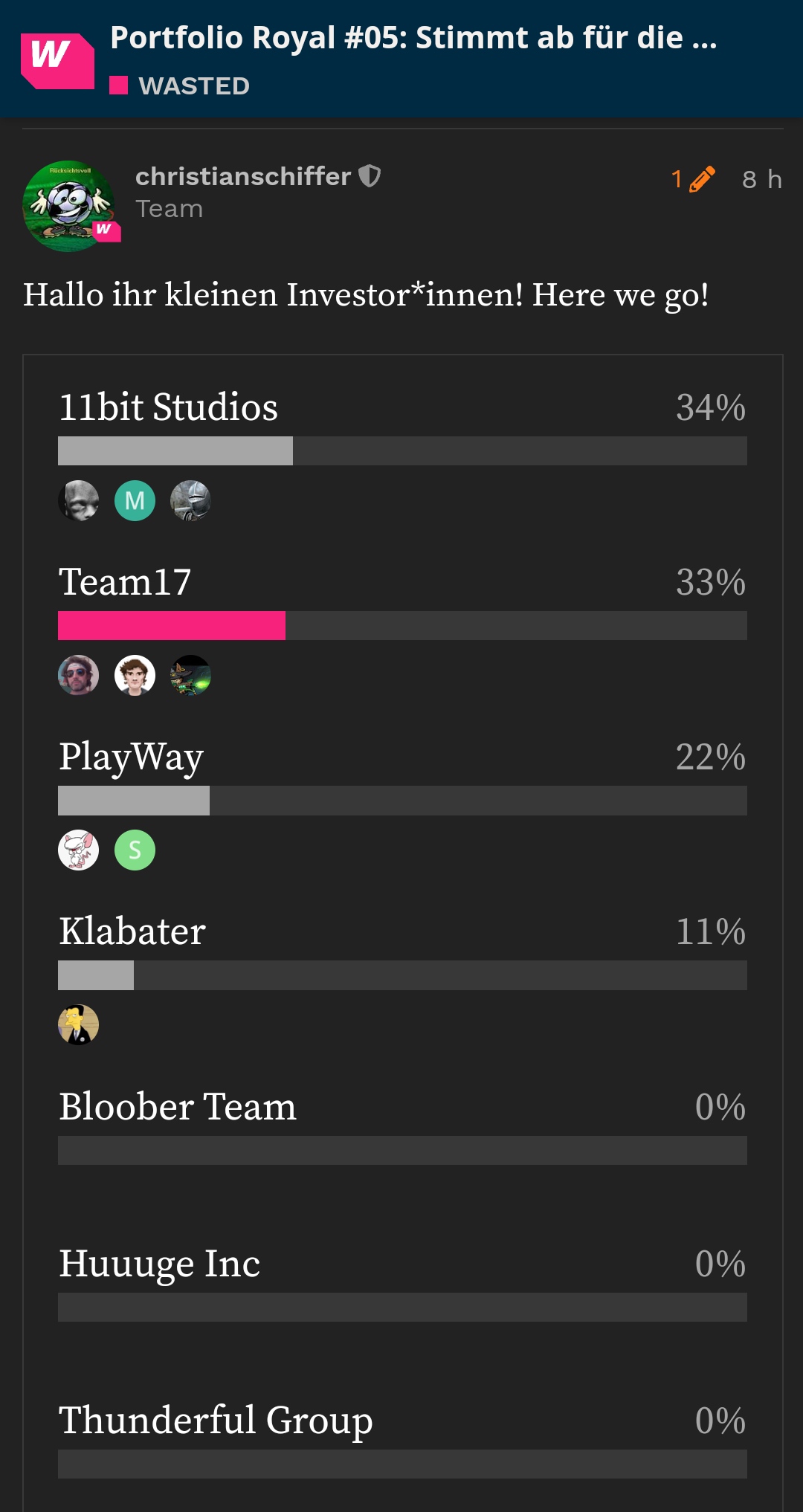 Ich stimm für Team 17, denn die anderen kenne ich nicht. Vor 30 Jahren war das mal ein aufstrebendes, vielversprechendes Unternehmen mit State of the Art-Technik, geilen Spielen, geiler Grafik, super Sound: Project X, Alien Breed … und dann haben sie sich entschlossen 26 Jahre lang nur noch Ballerburg mit Würmern zu machen und sage und schreibe 33 Worms-Spiele produziert.