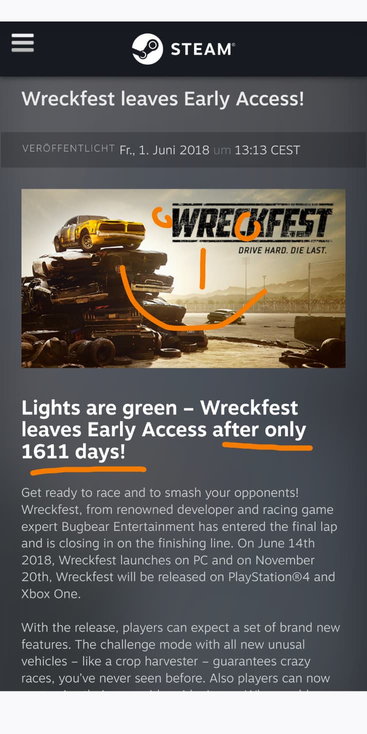 Es ist jetzt schon geil. Klar, hat kaum Strecken, aber die Schadensmodelle, Fahrgefühl usw. ist schon Wreckfest und es läuft stabil. Was will man mehr?