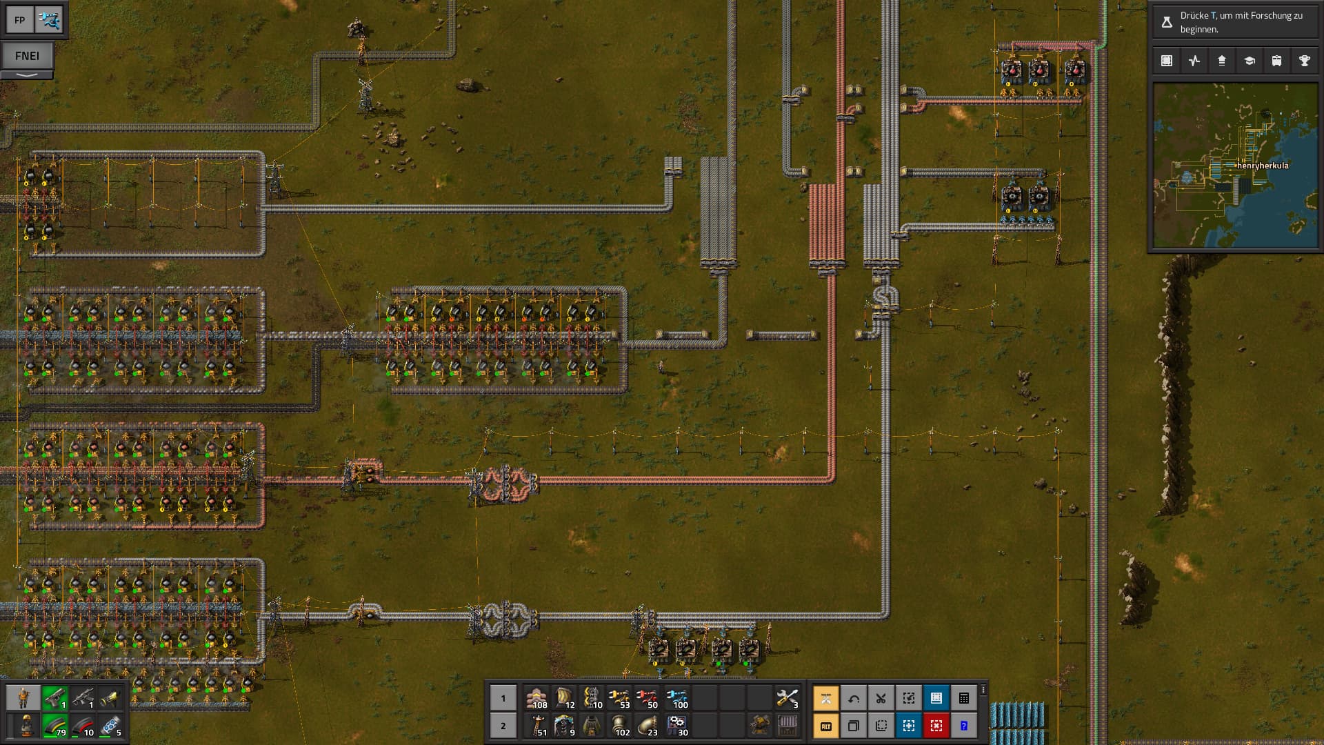 Also erst mal Umstieg von Kohle auf Solarfelder, aber dafür mussten erst die Bestandteile dafür automatisiert werden. Dann gingen mir für diese Automatisierung aber die grünen und roten Schaltkreise aus, also musste ich natürlich erst mal diesen Flaschenhals flicken.