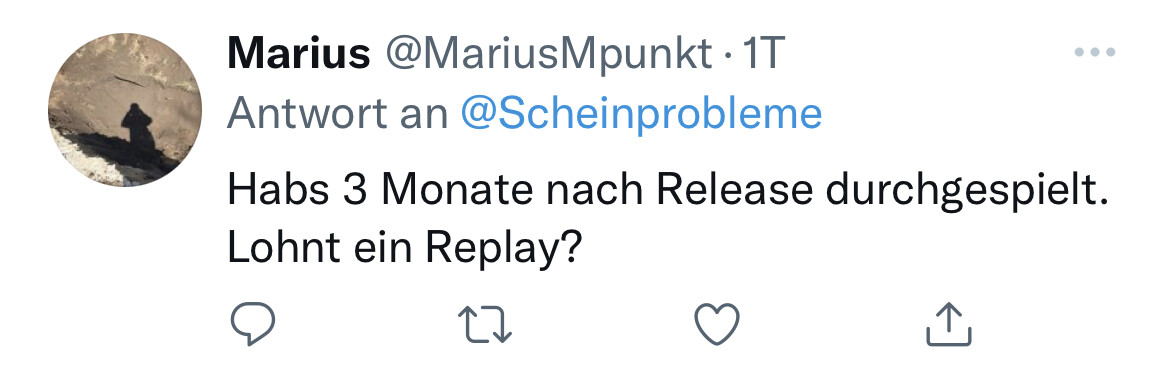 Den Reply in dem jemand ganz offen und unverschĂ€mt zugibt, dass er das Spiel schon durchgespielt hat und öffentlich darĂŒber nachdenkt, es NOCHMAL zu tun? Das war wirklich ein groĂes Versehen, danke fĂŒr den Hinweis!