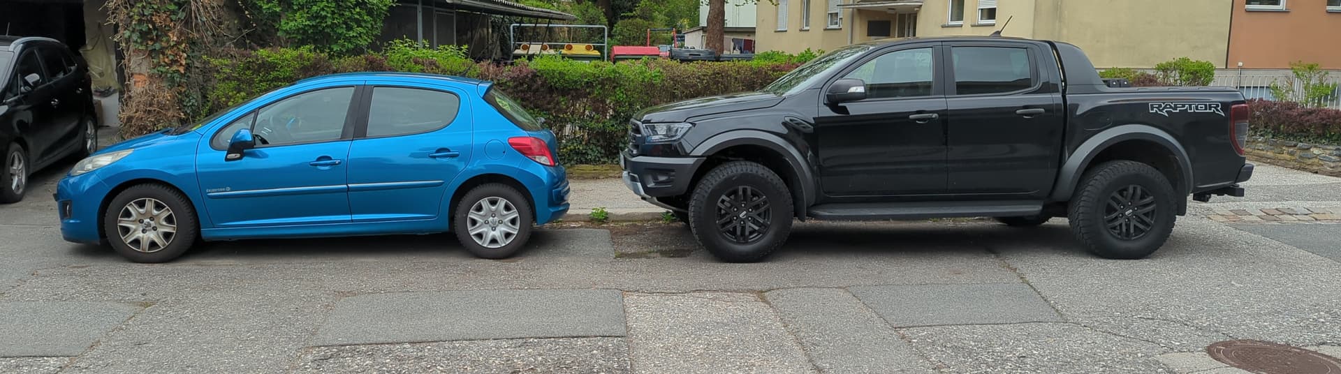 Was mir dazu übrigens noch einfällt. In Wien ist es eigentlich verboten auf dem Fußgängerweg zu parken, also auch dieser Überhang. Deswegen hat der Bezirksbürgermeister von Simmering einfach Kurzerhand den Fußgängerweg an einer Straße abgeschafft: