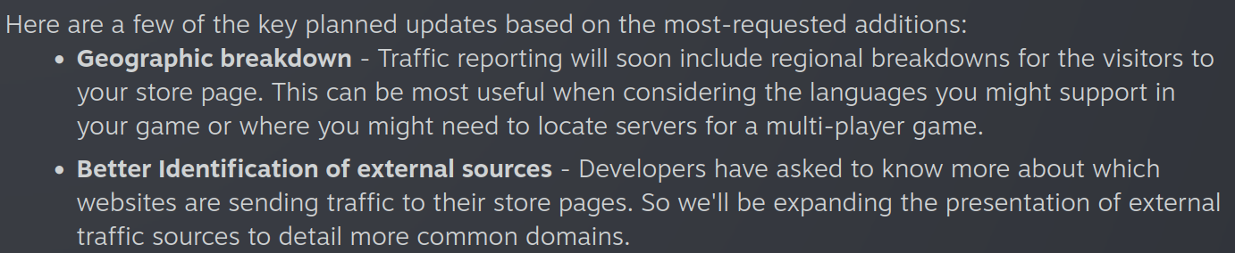 All the tools and features that we discuss here are built with player privacy in mind; Steam will continue to not share personally identifiable information. This approach to privacy means that some trade-offs have been made along the way that limits how specific some reporting can be. In most cases, it simply means that any traffic sources that are below a threshold of volume will get reported as „other“. We intentionally don’t collect or store demographic information about users such as age, gender, or race.