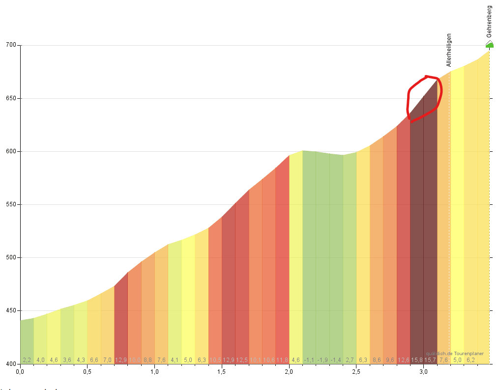 Immer wieder schön wenn man nichtsahnend und ortsunkundig um die Kurve fährt und plötzlich vor einem Hügel steht, den man unmöglich mit 48/16 hochkommt.