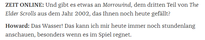 Das Wasser meinte ich damit. Weil es beim Thema Morrowind gefühlt immer darum geht, wie geil das Wasser damals war. Also ja, Redewendung. ![]()