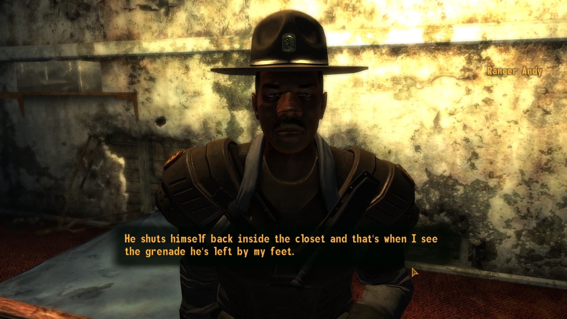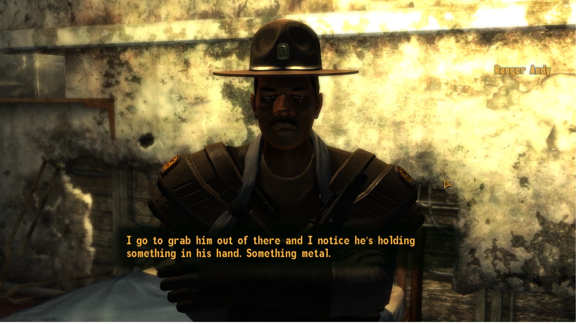 Das ist ein völlig unbedeutender NPC in FO New Vegas. Der sagt solche Sätze, wenn du ihn auf seine Kriegsverletzung ansprichst.