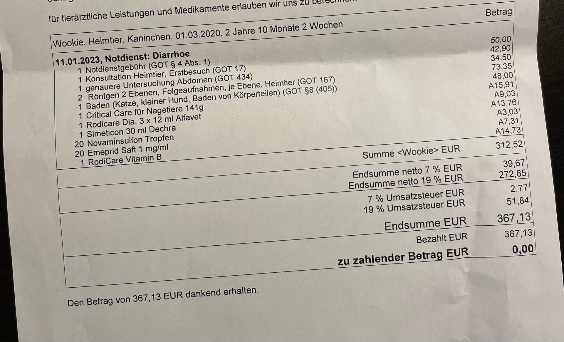 Ich hatte auch schon diverse Haustiere, aber vor Rechnungen wie die von @lnhh wurde ich bisher zum Glueck verschont. Die Kostenaufstellung vom Kaninchen find ich aber interessant. Baden knapp 50Euro, Untersuchung Abdomen (Abtasten!?) 35Euro, … da sind die Medikamente ja echt vernachlaessigbar…
