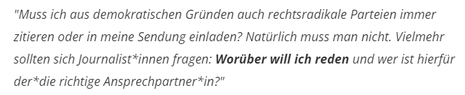 Der ÖRR hat keine Pflicht Vertreter:innen einer Partei wie die von der AfD einzuladen. Im Gegenteil sie dürfen das streng genommen gar nicht bei Parteien die demokratieschädigend sind und da vermutlich bald die gesamte bundesdeutsche Partei AfD als gesichert rechtsextrem und nicht „nur rechtsradikal“ eingestuft wird trifft das dort schon zu.