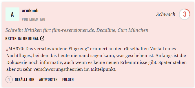 Neutrale Stimmen der Vernunft kommen in diesem Werk viel zu kurz. Wie gesagt: für mich ist dieses Machwerk fast reine Sensationsbefriedigung. Was nicht heißen soll, dass die offiziellen Behören/Staaten mit Richtigkeit bei ihren Angaben und Transparanz glänzen. Aber daraus sowas zu stricken wie dieses dreiteilige MH370-Ding, ist eine Frechheit für alle Angehörigen und Betroffenen.