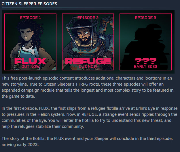 Es gibt einige Spiele, die mit gleichen Mitteln - Musik, Standbilder, Text - arbeiten, so z.B. auch Roadwarden. Aber während die anderen eher gewöhnungsbedürftig sind, schafft Citizen Sleeper den „Sog“ gleich schon von Anfang an. Das ist wohl einfach erzählerisches Können.