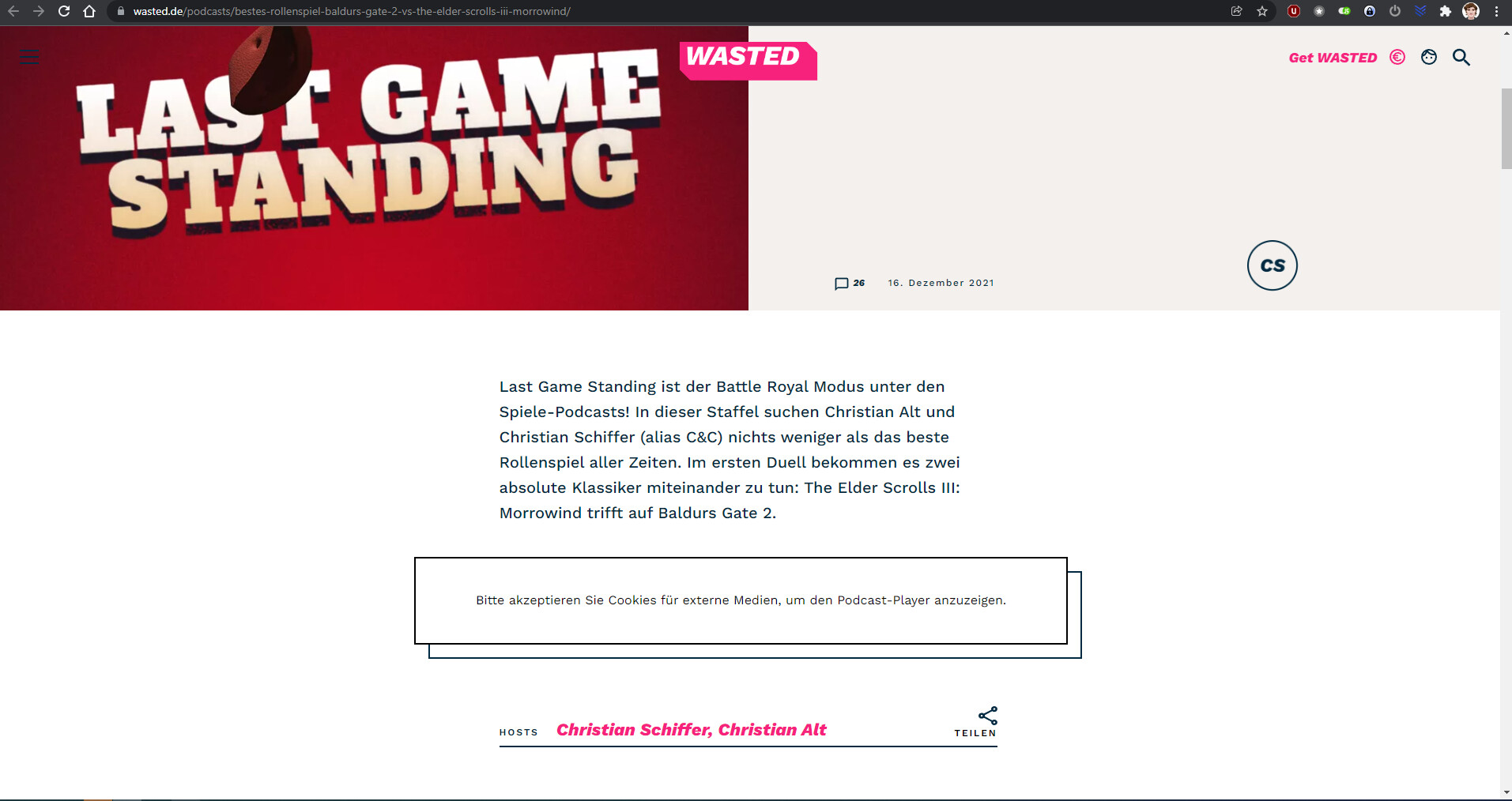 In der Zwischenzeit, als Workaround: wenn Du Cookies für wasted.de einmal löschst (oder wahlweise nen Inkognito-Modus nutzt), und dann beim Anfangs-Cookie-Dialog entweder „alles auswählen“ klickst oder „Externe Medien“ aktivierst und dann speicherst, sollte der Player geladen werden.