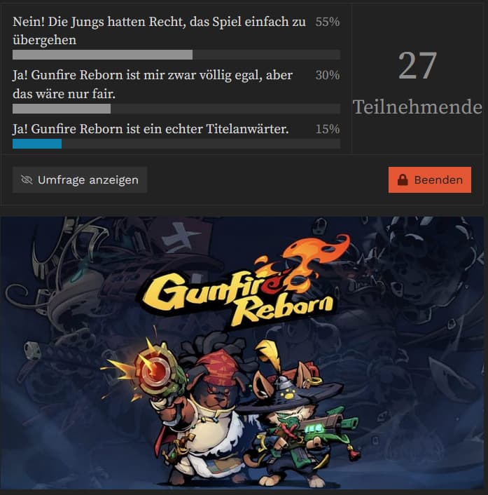 @anon38957722 hat ja einen guten Vorschlag gemacht, mit den verschmähten Spielen des Jahres 2021… Wie auch immer. Der Meme Kampf muss jetzt wieder Richtung Gürtel gehen… Der Ring ist groß genug ![]()