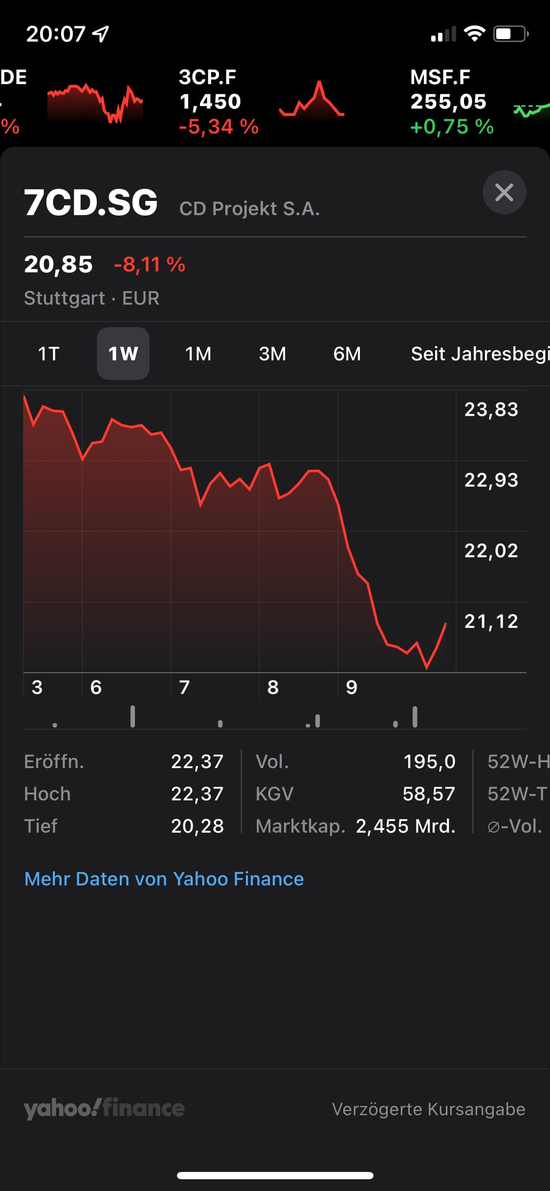 Scalable erlaubt mir leider keine Screenshots, aber mein eigenes Depot lacht hysterisch über die aktuelle Wahl CD P.R. ist die einzige meiner Aktien, die Minus macht. Aktuell -27,99% seit Kauf Ende April. Ich ignoriere sie immer gekonnt, in der Hoffnung, dass Witcher 4 das irgendwann wieder rausreißt. (Ich hab nicht viel gekauft, tut mir also nicht so weh).